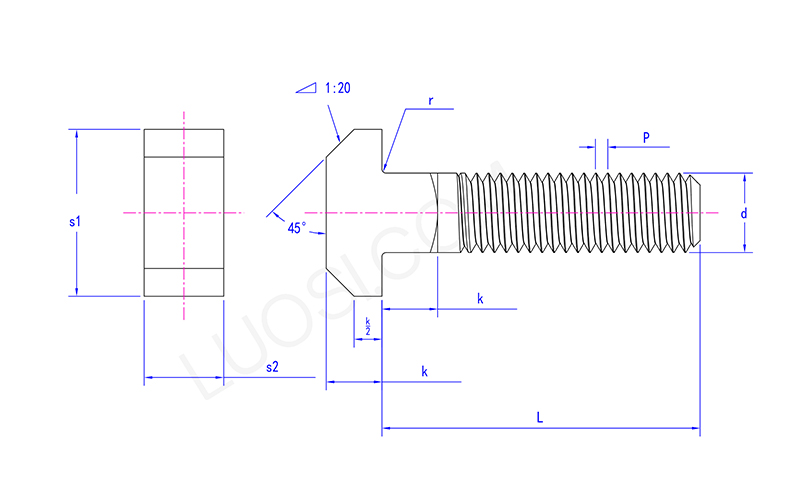 Голова квадратной шеи T болты - это горизонтально расположенная форма «T», как буква «T». Эта широкая Т-образная головка позволяет застрять болт в Т-образной канавке оборудования, играя роль в предотвращении выталкивания болта.